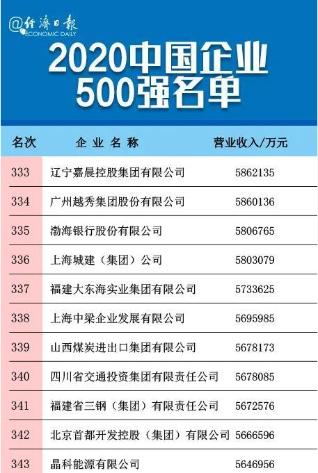 2020年9月28日,中國500強(qiáng)企業(yè)高峰論壇全體大會(huì)在鄭州召開,會(huì)上發(fā)布了“2020中國企業(yè)500強(qiáng)”。榜單顯示,遼寧嘉晨控股集團(tuán)有限公司榜單排名第333位。