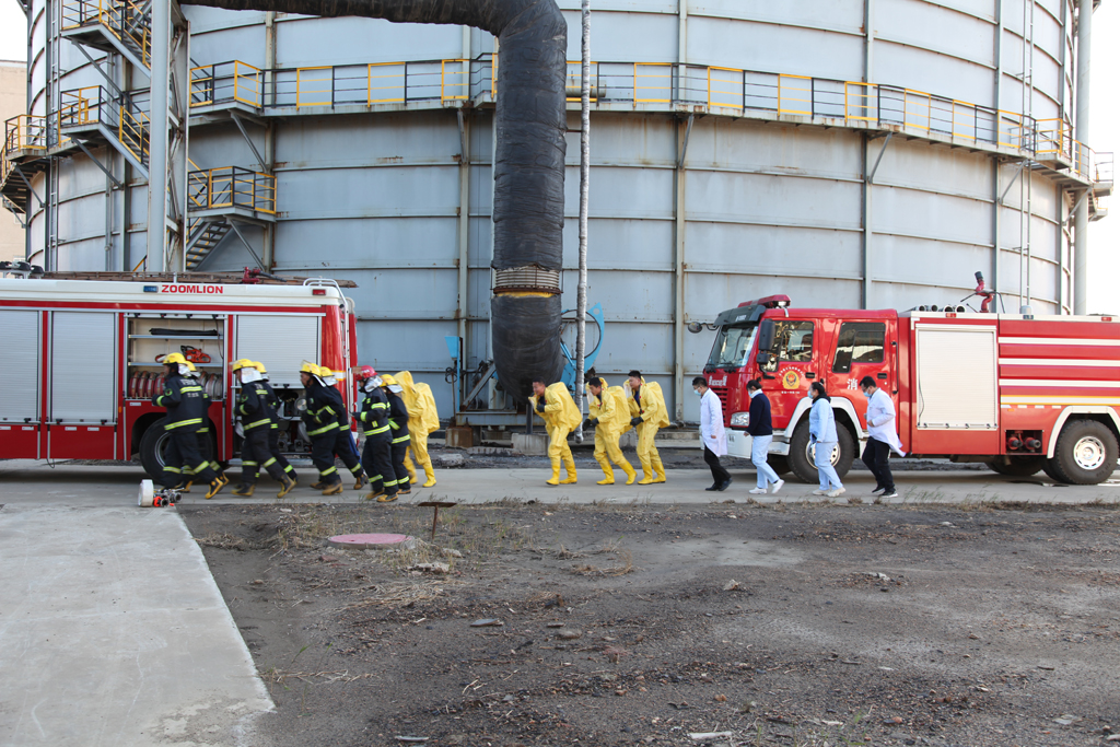 演練模擬場(chǎng)景為公司煤氣柜旁加壓機(jī)房煤氣出口管道閥門與法蘭連接處產(chǎn)生煤氣泄漏,造成3人中毒,隨后泄露煤氣與泄漏點(diǎn)管壁摩擦產(chǎn)生靜電引燃煤氣造成火災(zāi)事故。公司接警后立即啟動(dòng)應(yīng)急響應(yīng),按照應(yīng)急預(yù)案及時(shí)對(duì)傷員救治,并迅速組織搶維修人員趕赴現(xiàn)場(chǎng)進(jìn)行應(yīng)急處置,同時(shí)將險(xiǎn)情上報(bào)至政府相關(guān)部門,應(yīng)急、公安、消防、生態(tài)環(huán)境、衛(wèi)生健康等應(yīng)急聯(lián)動(dòng)力量立即趕赴現(xiàn)場(chǎng)協(xié)同處置.